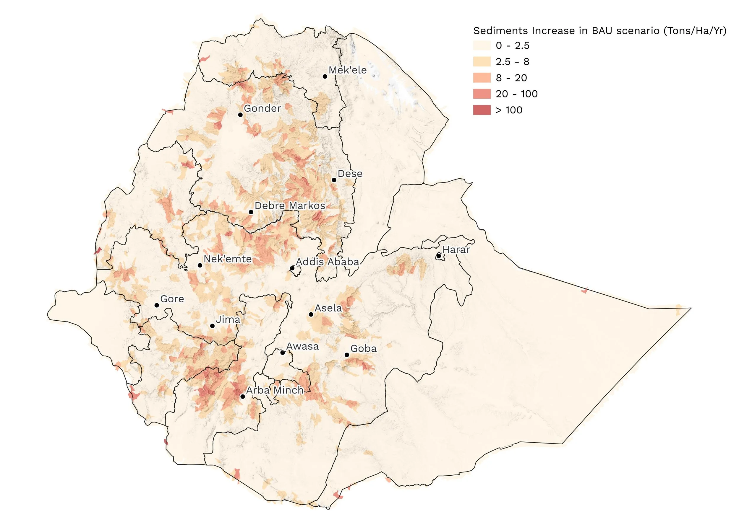 Building on these past trends, our analysis highlighted areas in the country likely to see the largest increases in soil loss and sedimentation from ongoing land degradation, if action is not taken.