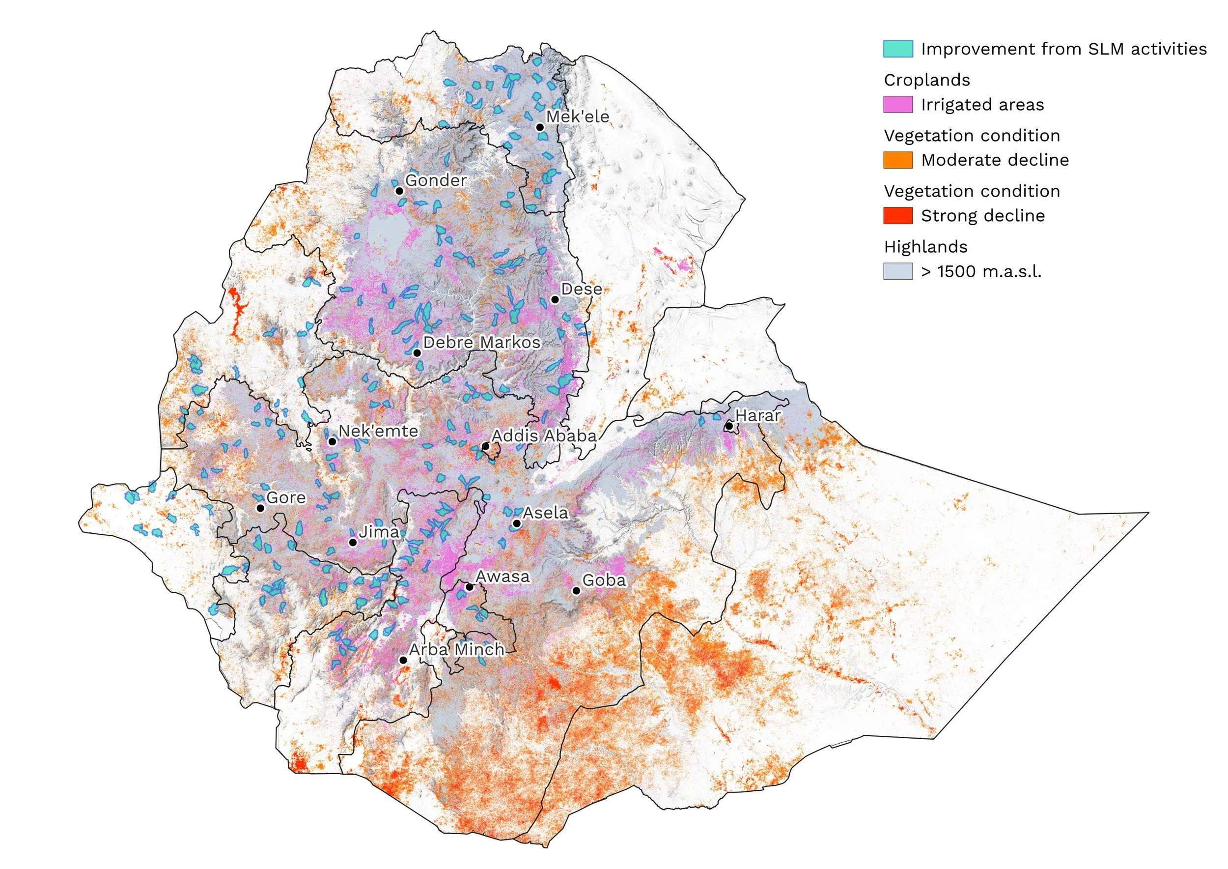 Of particular note are improvements in the highlands, which received recent investments in SLM by the government of Ethiopia under programs including the World Bank-funded Climate Action Through Landscape Management (CALM) initiative. Our results also revealed new areas of landscape restoration priority in other parts of the country.