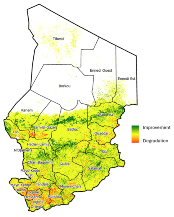 In this map, areas in red are at the highest risk of land degradation based on 20-year vegetation and areas in green have experienced some improvement.